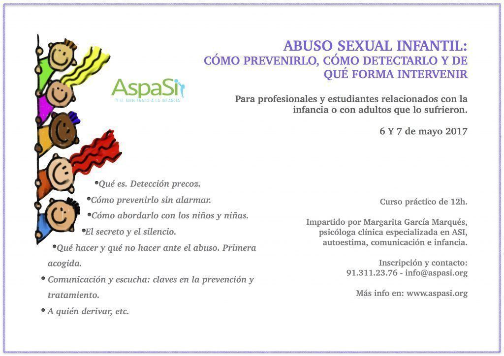 Como ya sabéis, aspaSI no sólo se dedica a la prevención y la sanación del abuso sexual infantil, sino que una de nuestras funciones como asociación es la formación a padres y profesionales relacionados con la infancia. El 15 de Noviembre comienza el Curso Abuso Sexual Infantil: Detección e Intervención en Niños/Niñas en el Colegio Oficial […]