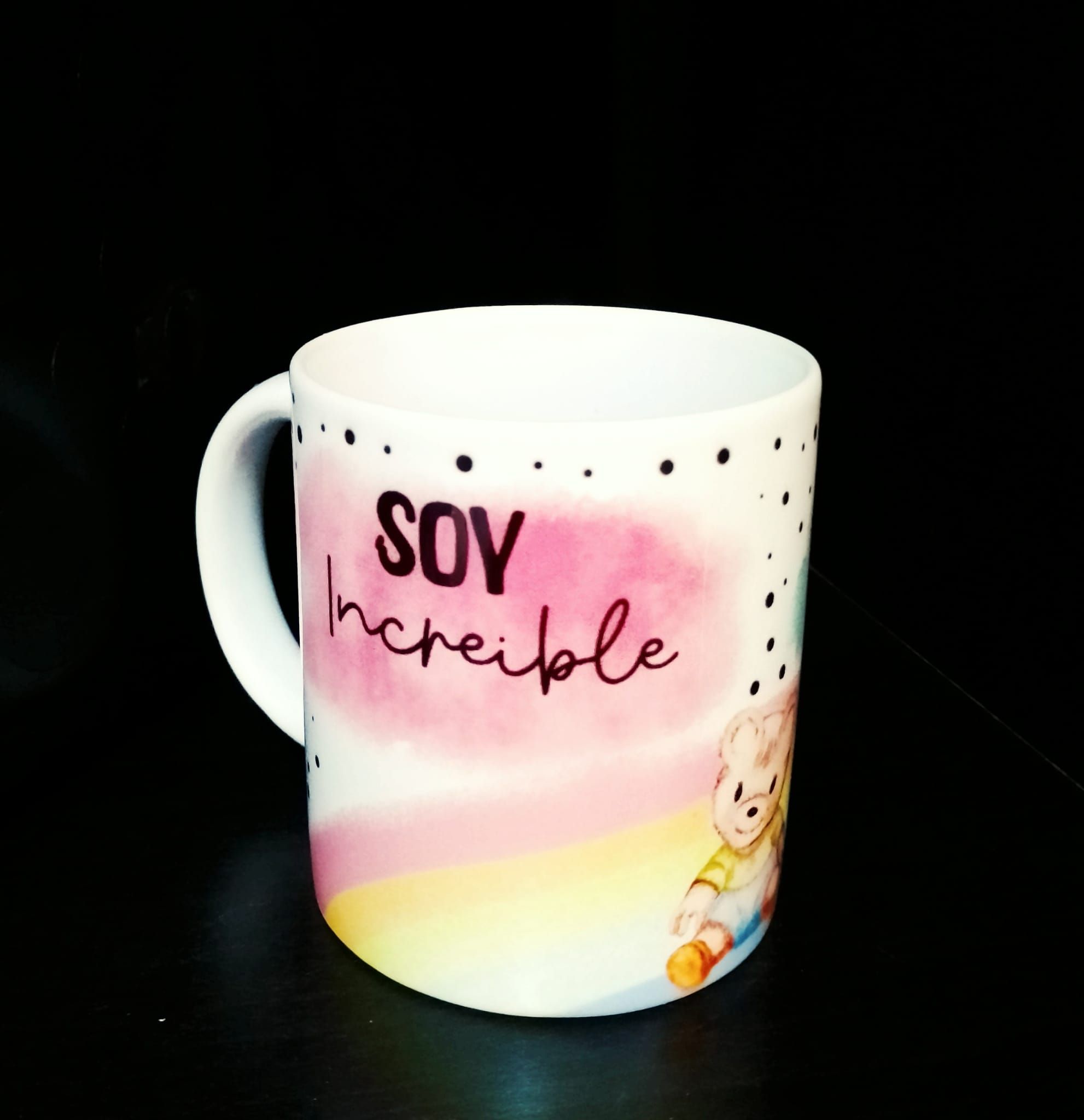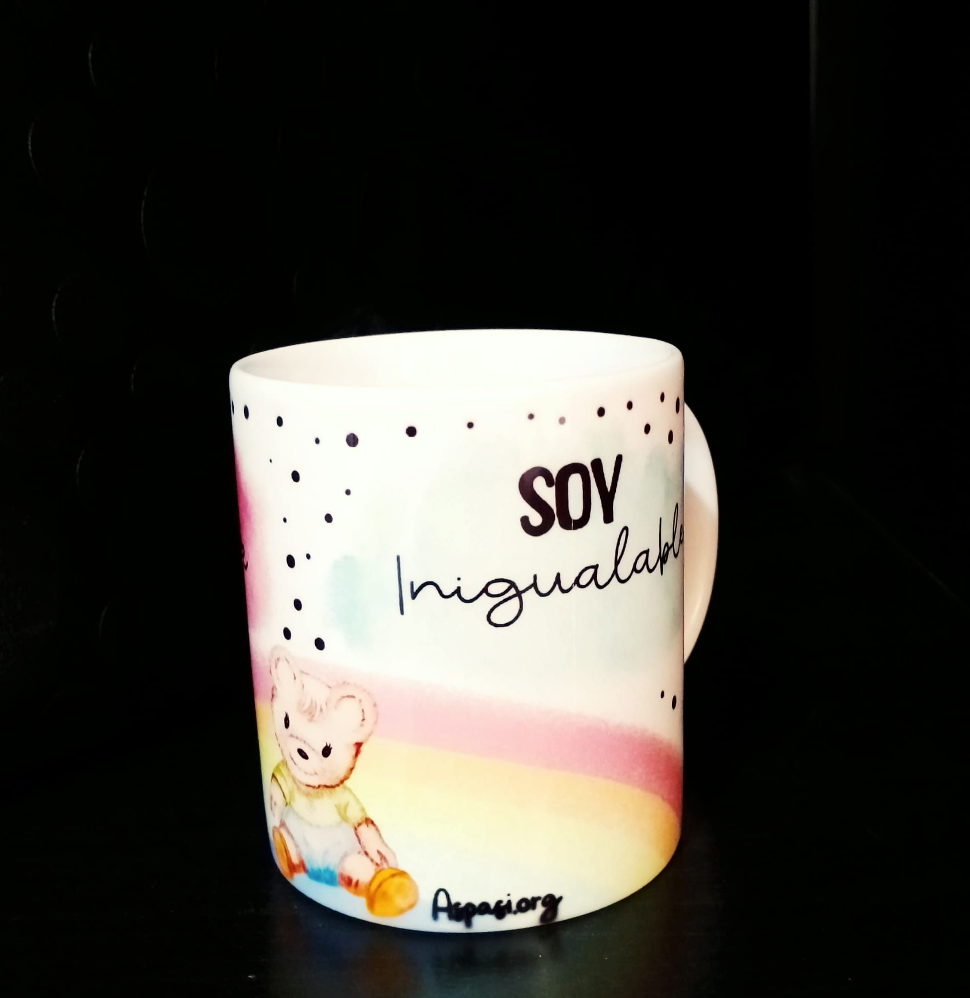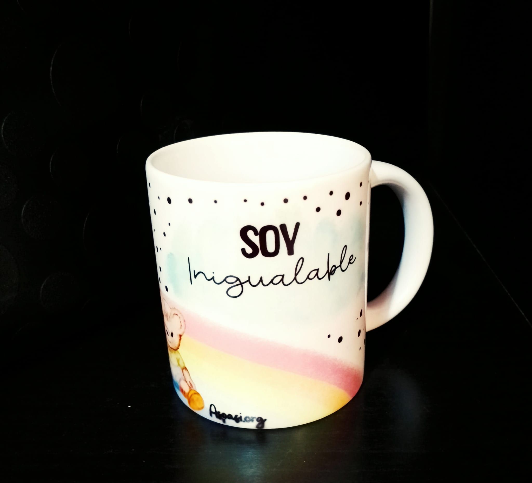 Taza de Aspasi y el buen trato a la infancia. Dibujo de la osita aspasi con el mensaje «Soy increible, Soy inigualable» y un arcoiris de fondo. Capacidad de 200 ml. Envío no disponible.