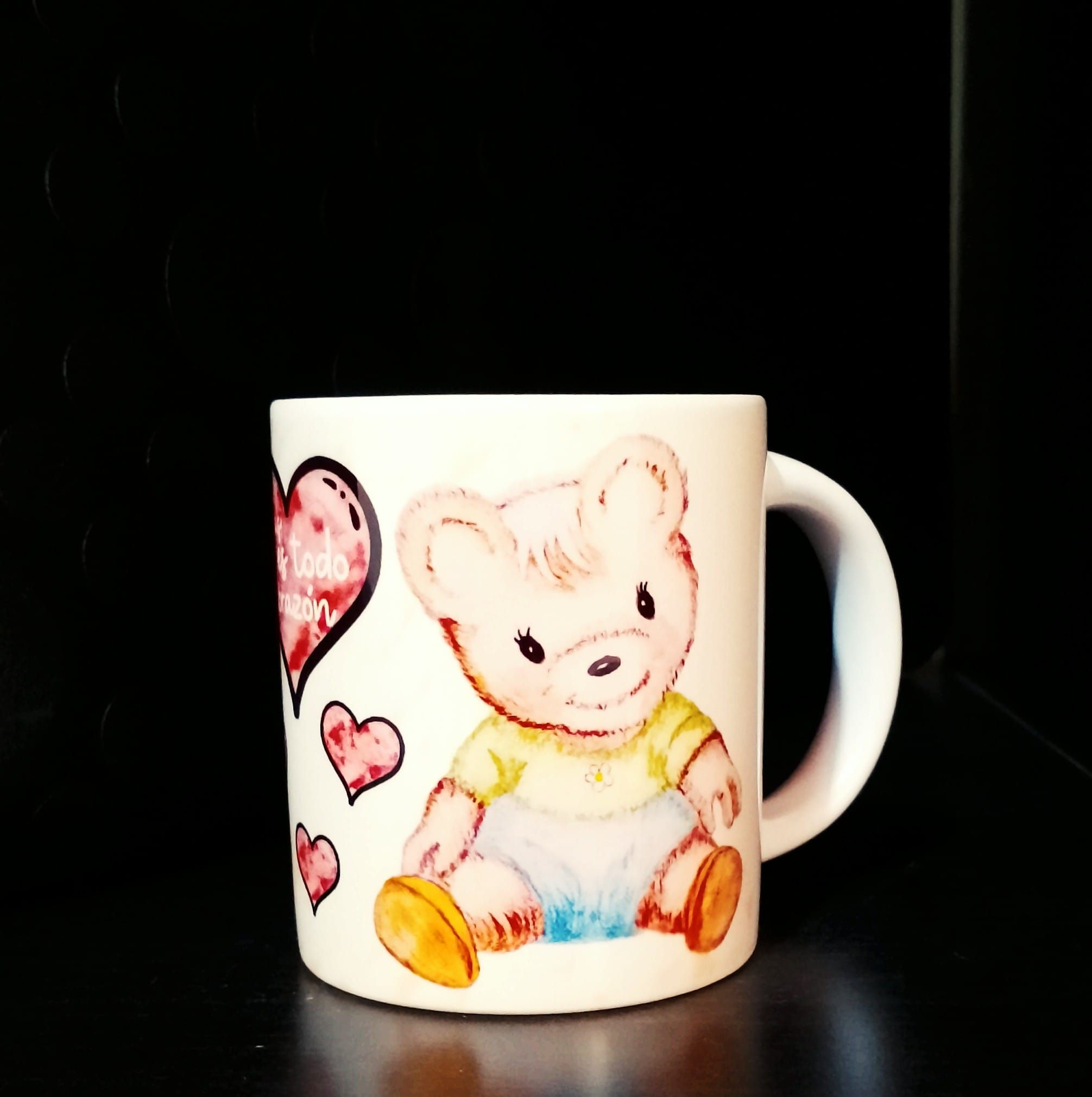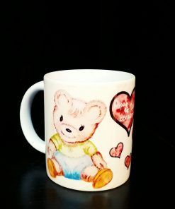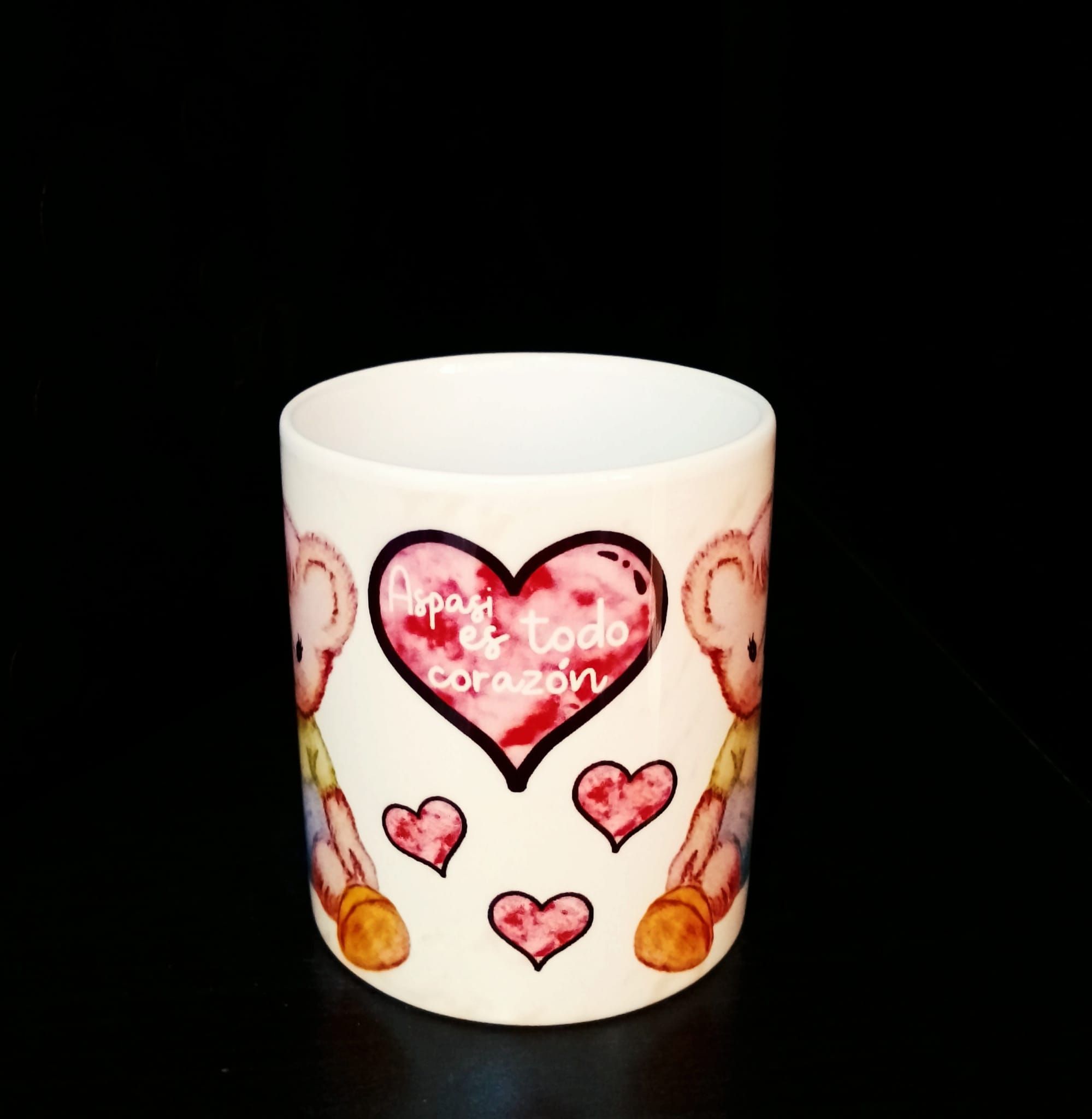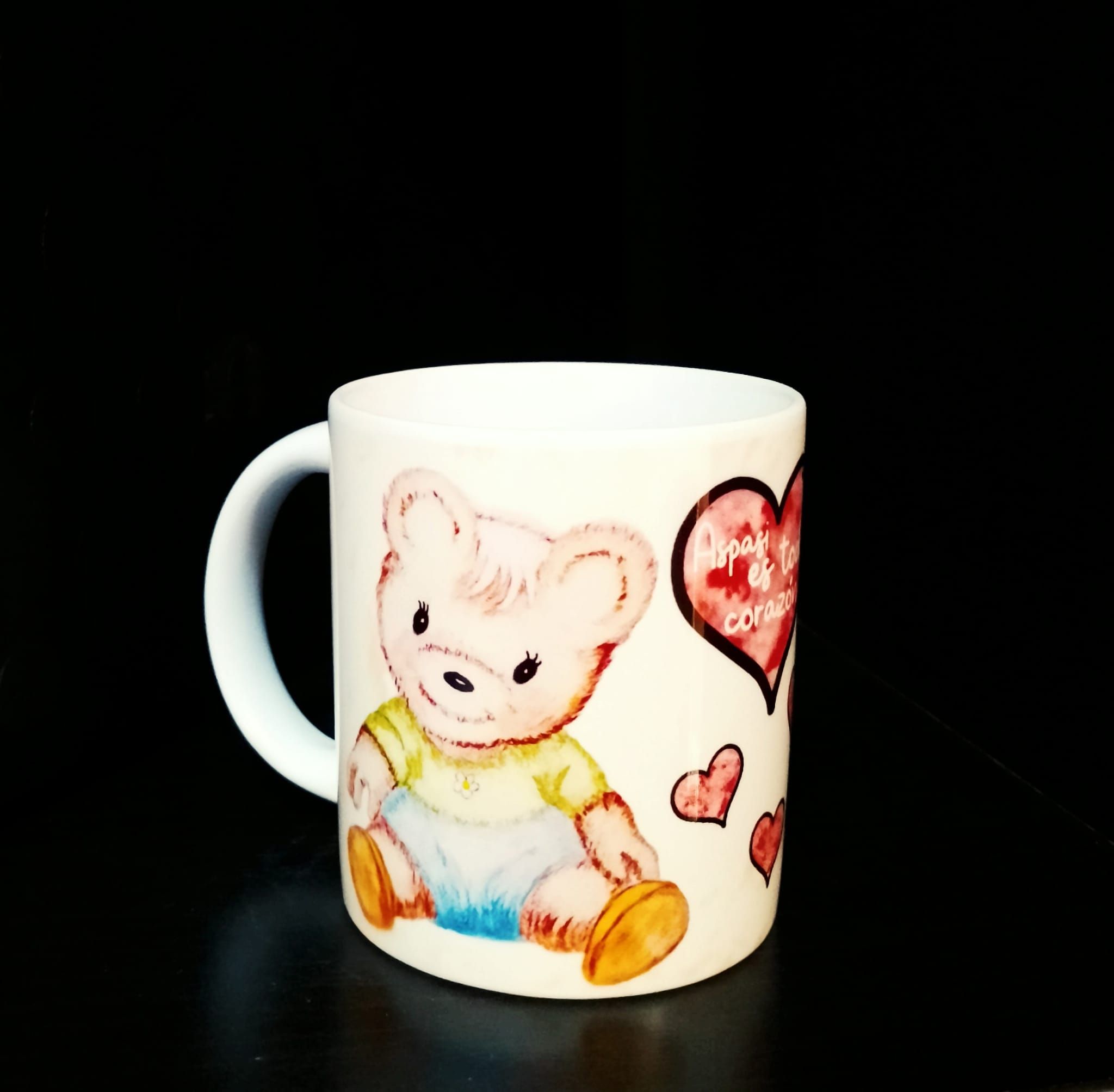 Taza de Aspasi y el buen trato a la infancia. Dibujo de la osita aspasi con el mensaje «Aspasi es todo corazón» y corazones de fondo. Capacidad de 200 ml. Envío no disponible.