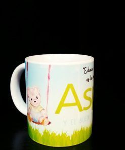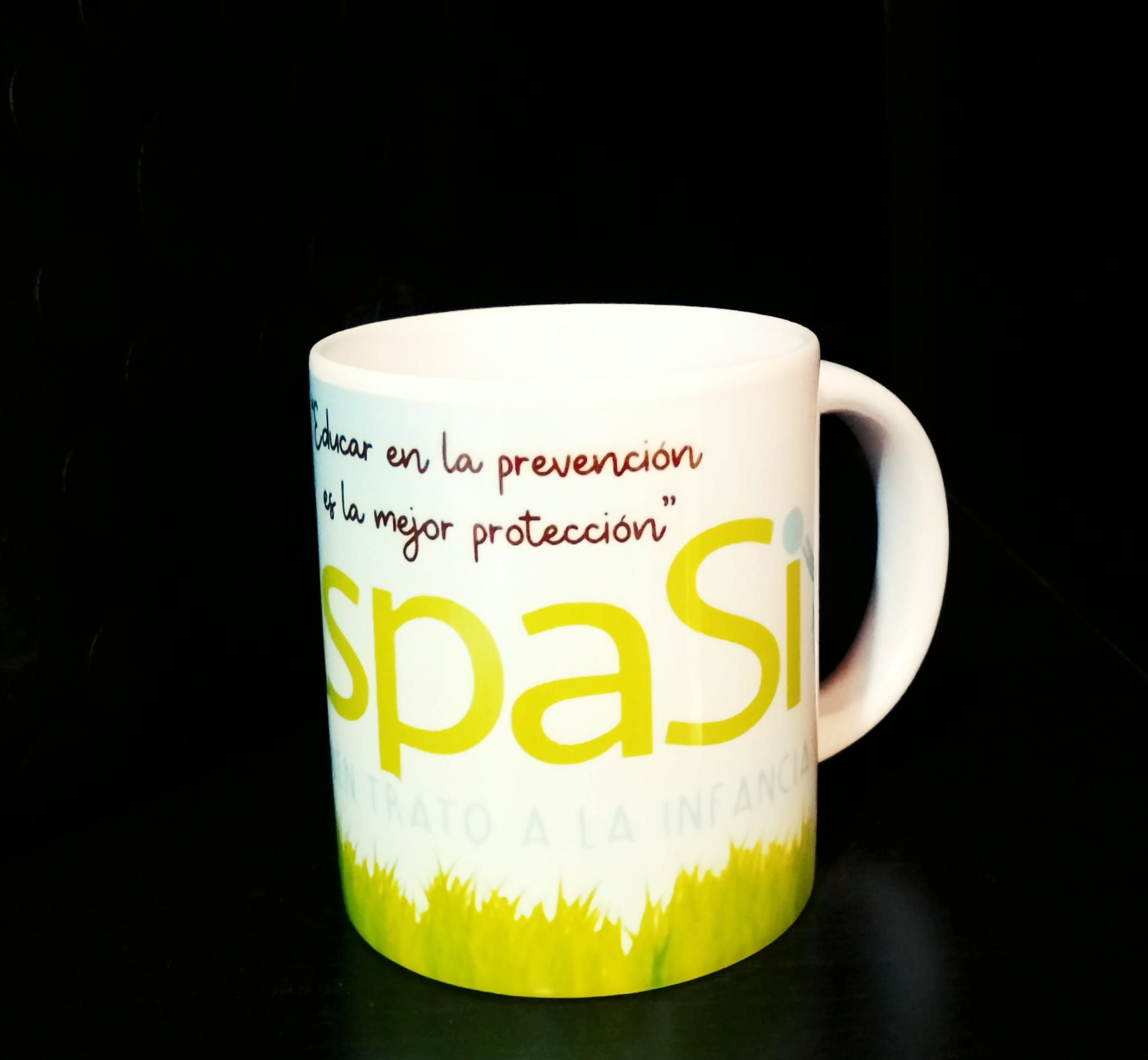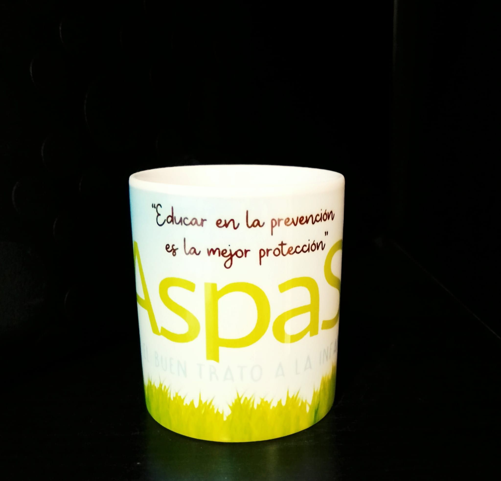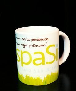 Taza de Aspasi y el buen trato a la infancia. Dibujo del logo de aspasi con el mensaje «Educar en la prevención es la mejor protección». Capacidad de 200 ml. Envío no disponible.