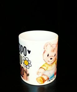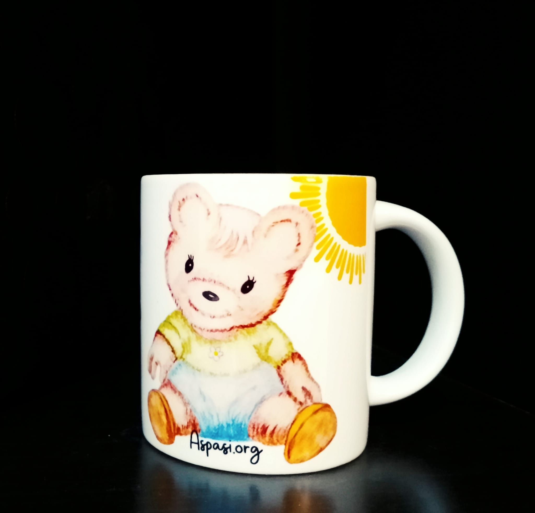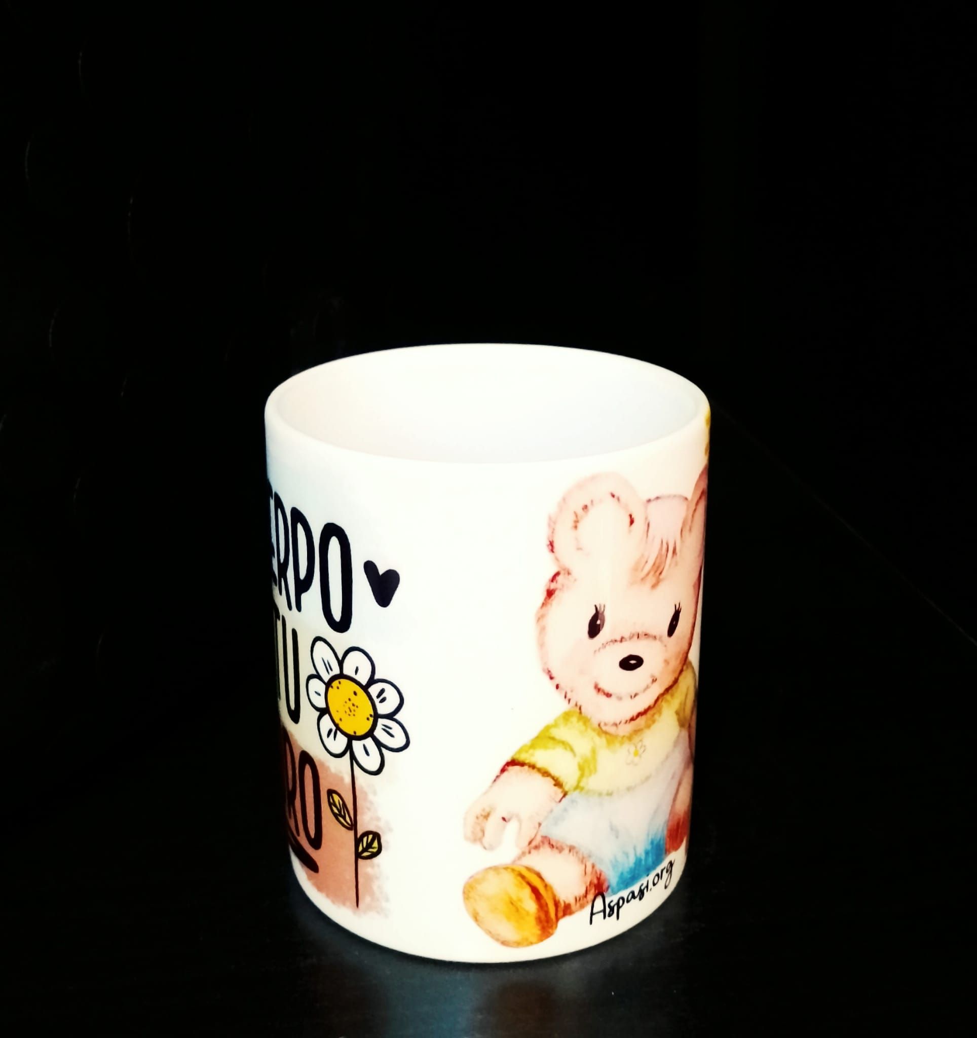 Taza de Aspasi y el buen trato a la infancia. Dibujo de la osita aspasi con el mensaje «Tu cuerpo es tu tesoro». Capacidad de 200 ml. Envío no disponible.